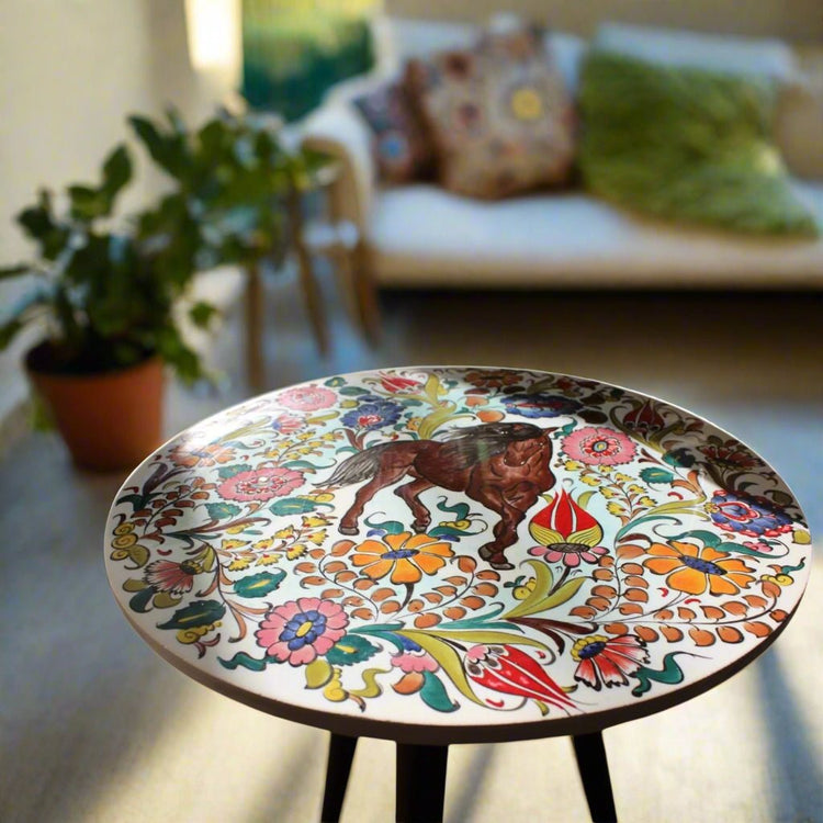 „Роха“ е ръчно изработена маса от керамика с флорален мотив и изрисуван кон.